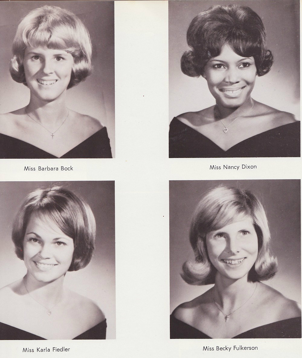 Homecoming Queen and court - 2nd row - Olivia Pollard, Nancy Huff, Donna Kennedy, Barb Bock, Nancy Dixon, Karla Fiedler, Becky Fulkerson
